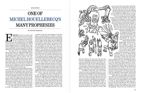 This piece reminded me why I loved Houellebecq's ATOMISED, which I read 20 years ago. The review is insightful and written with style. Describing the character Bruno, Marigold writes: "As soon as his nuts drop they grab the wheel." That's a great line.